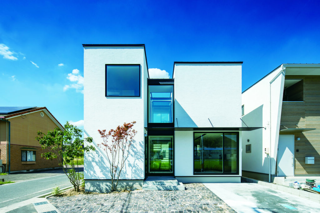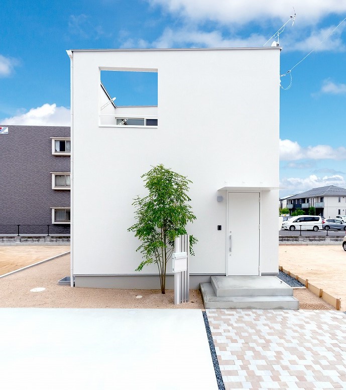 屋根は大きくシンプルな切妻(きりづま)形状が定番で、雨や雪に強く、すっきりとしたシルエットが魅力です。外壁はホワイト×ペールグレーやベージュ、ブルーといったツートンカラーの組み合わせが人気で、ほどよいアクセントになります。