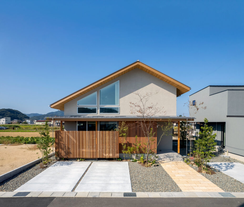 例えば、外壁には白やグレーの塗り壁を使い、軒や壁面の一部に国産無垢材を取り入れることで、シンプルながらも自然な風合いが引き立ちます。また、玄関まわりや窓に木格子やルーバーを設ければ、目隠しの役割を果たしながらも、風や光はしっかり取り込めます。