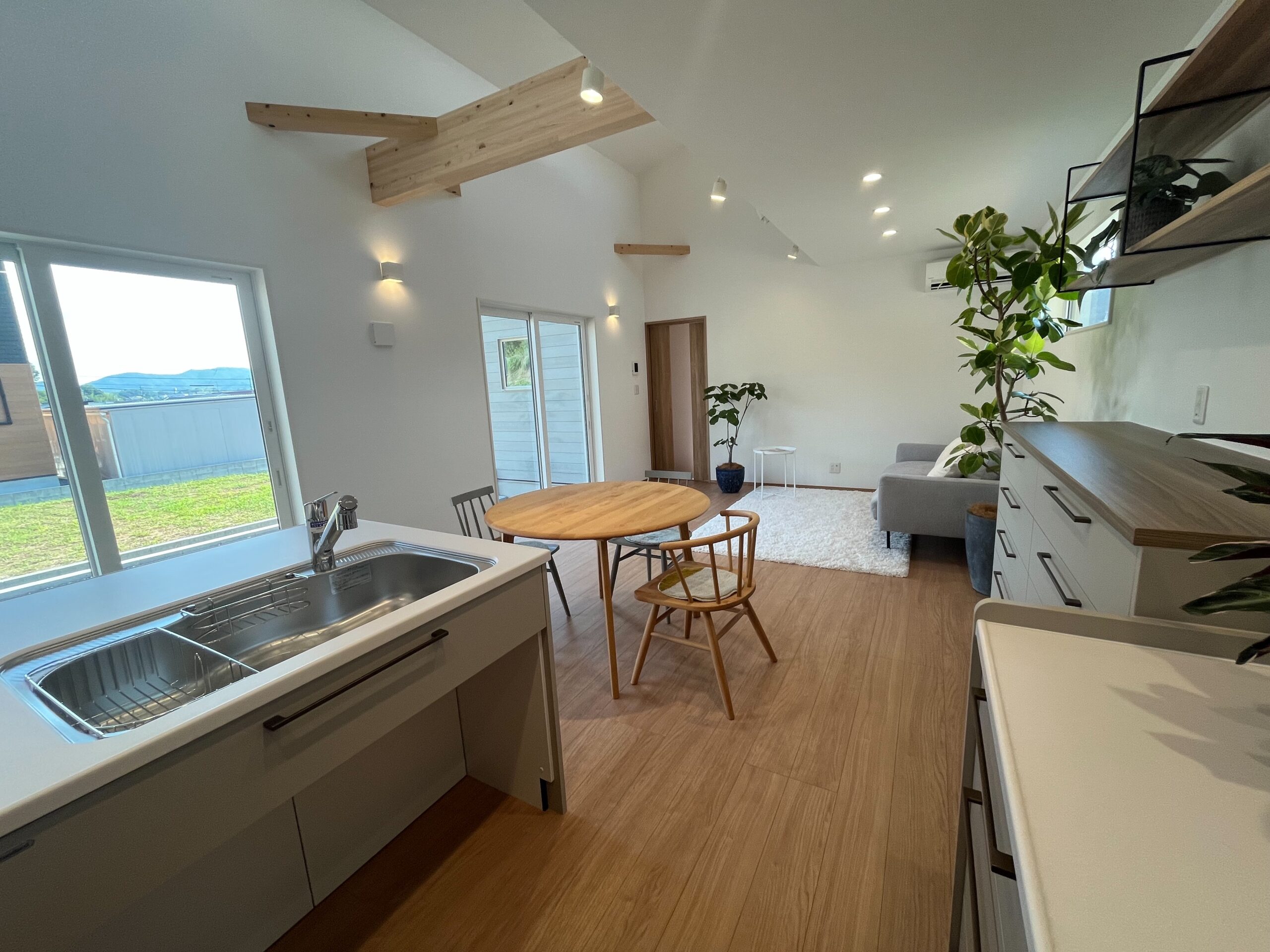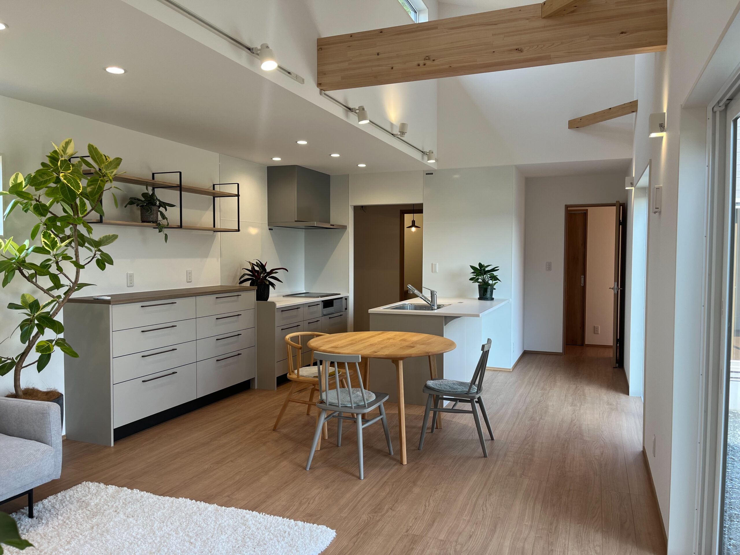 平屋ながら屋根を高く取り、南側ハイサイドライトからたっぷり採光。明るく伸びやかなリビングは、シンプルナチュラルな内装と相まって心地よさ◎。