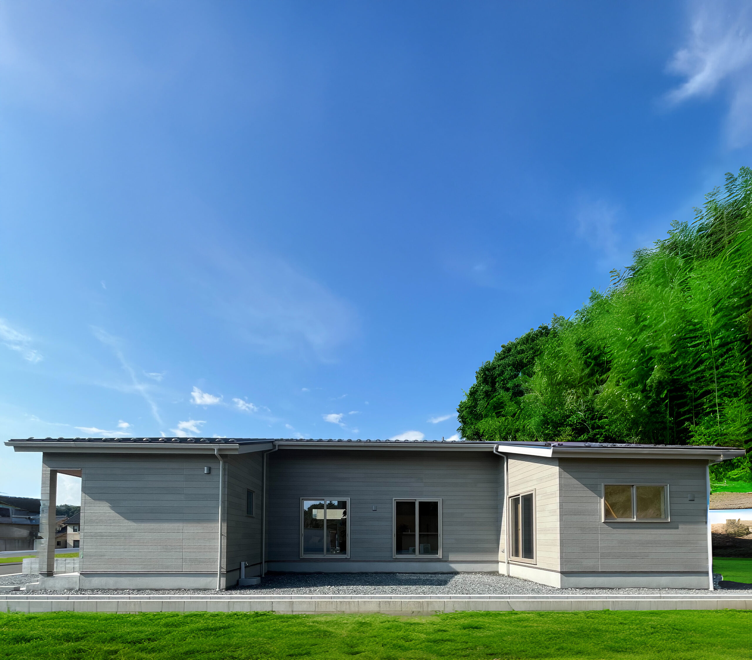 コの字レイアウトが生む半屋外空間で、休日はBBQやプール遊びを気軽に。敷地が広いので車2台+来客用1台も余裕です。
