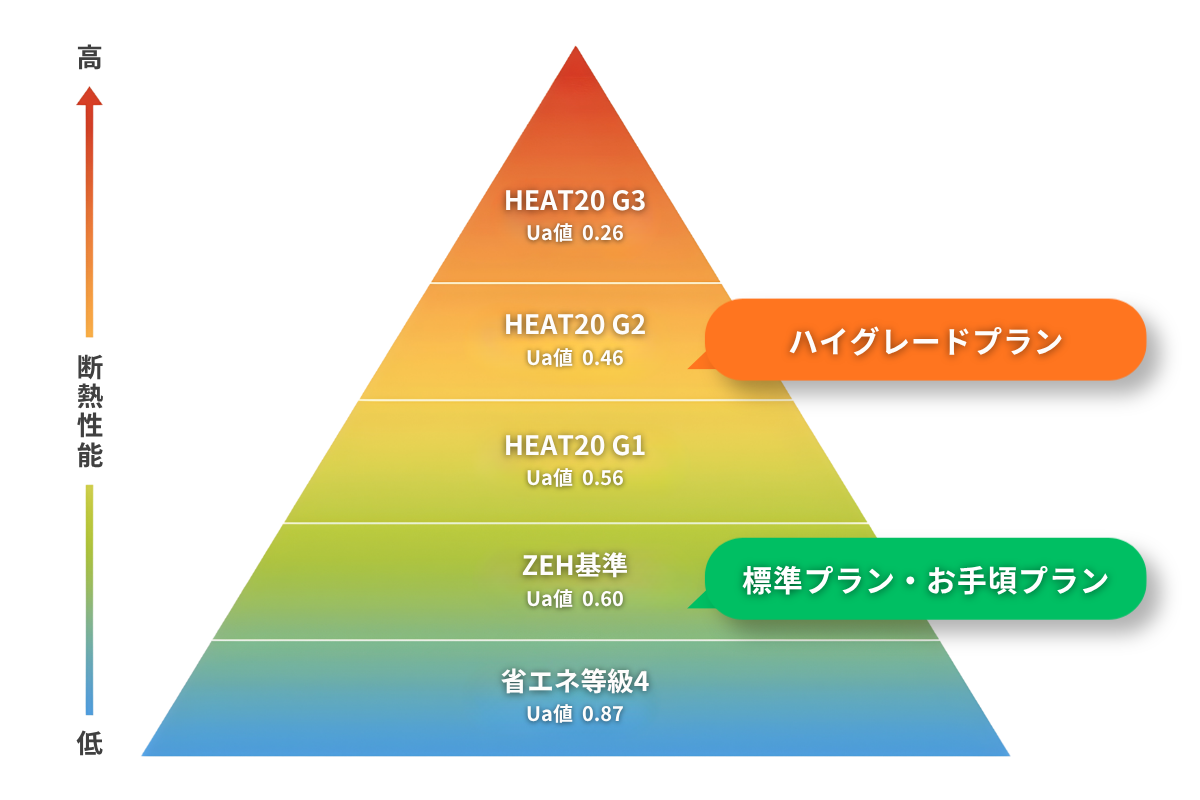 この価格帯では難しいZEH基準を当たり前にクリア。それだけでなく、ハイグレードプランでは、長期優良住宅・HEAT20のG2レベルをクリアしています。