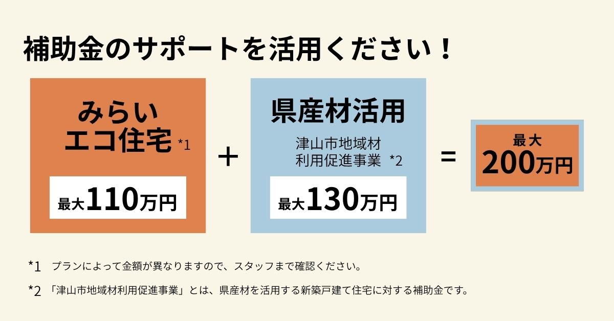 津山・岡山での家づくりを応援する補助金(最大200万円)の申請も、地域を知り尽くした私たちがフルサポートします。(令和7年度実績。今年度については、スタッフまでお問い合わせください。)